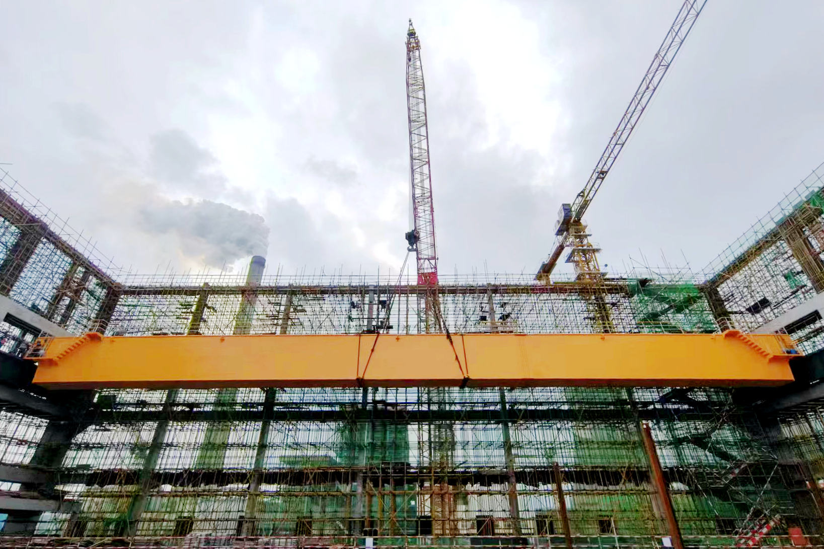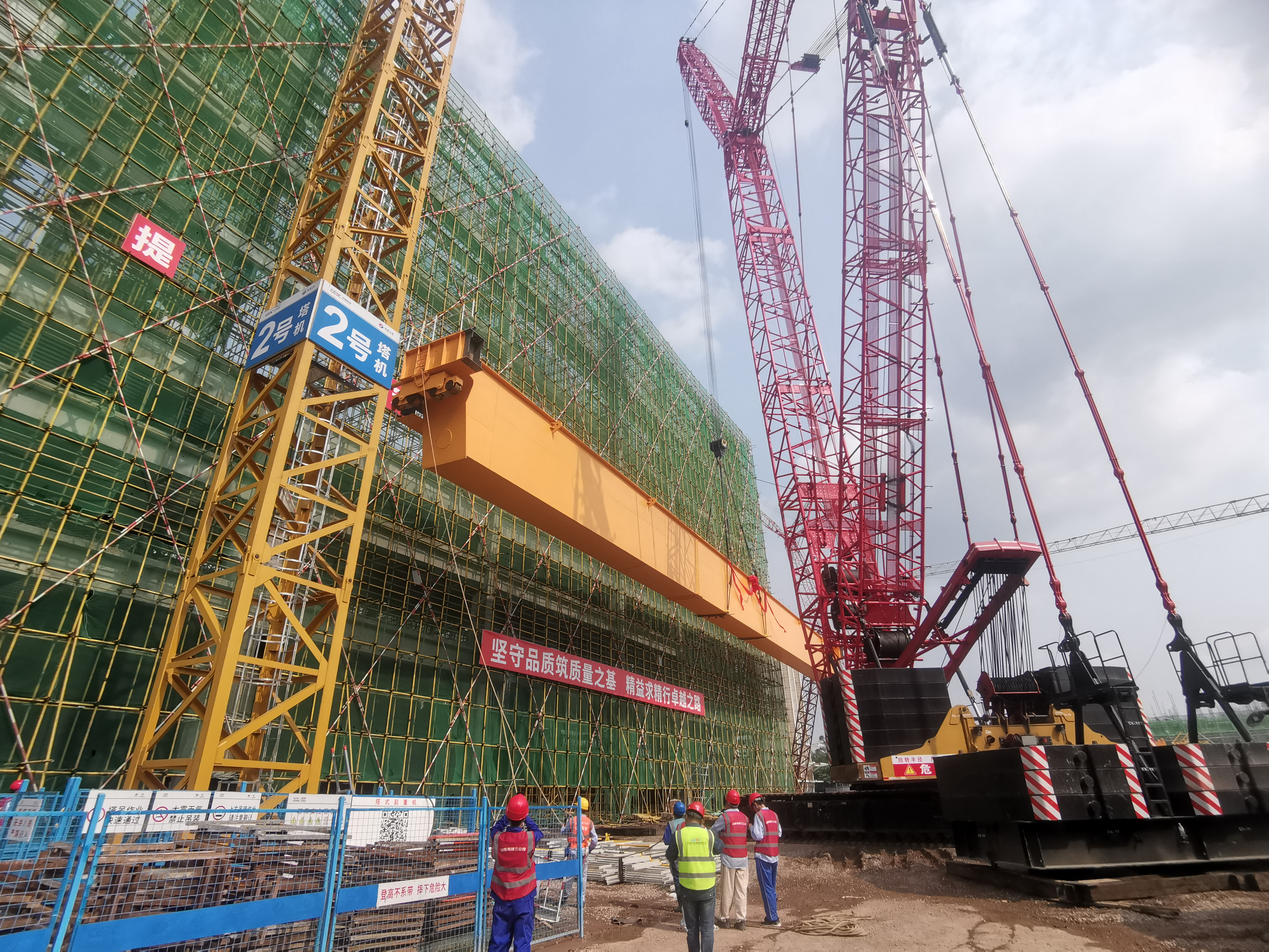 4月29日12點(diǎn),施工單位完成吊裝前施工安全技術(shù)交底,15點(diǎn)24分,在完成吊具調(diào)整、試吊及吊前各方仔細(xì)檢查確認(rèn)后,行車在400噸履帶吊牽引下緩緩升起,歷經(jīng)一個半小時后穩(wěn)穩(wěn)落定在主廠房27.5米層。