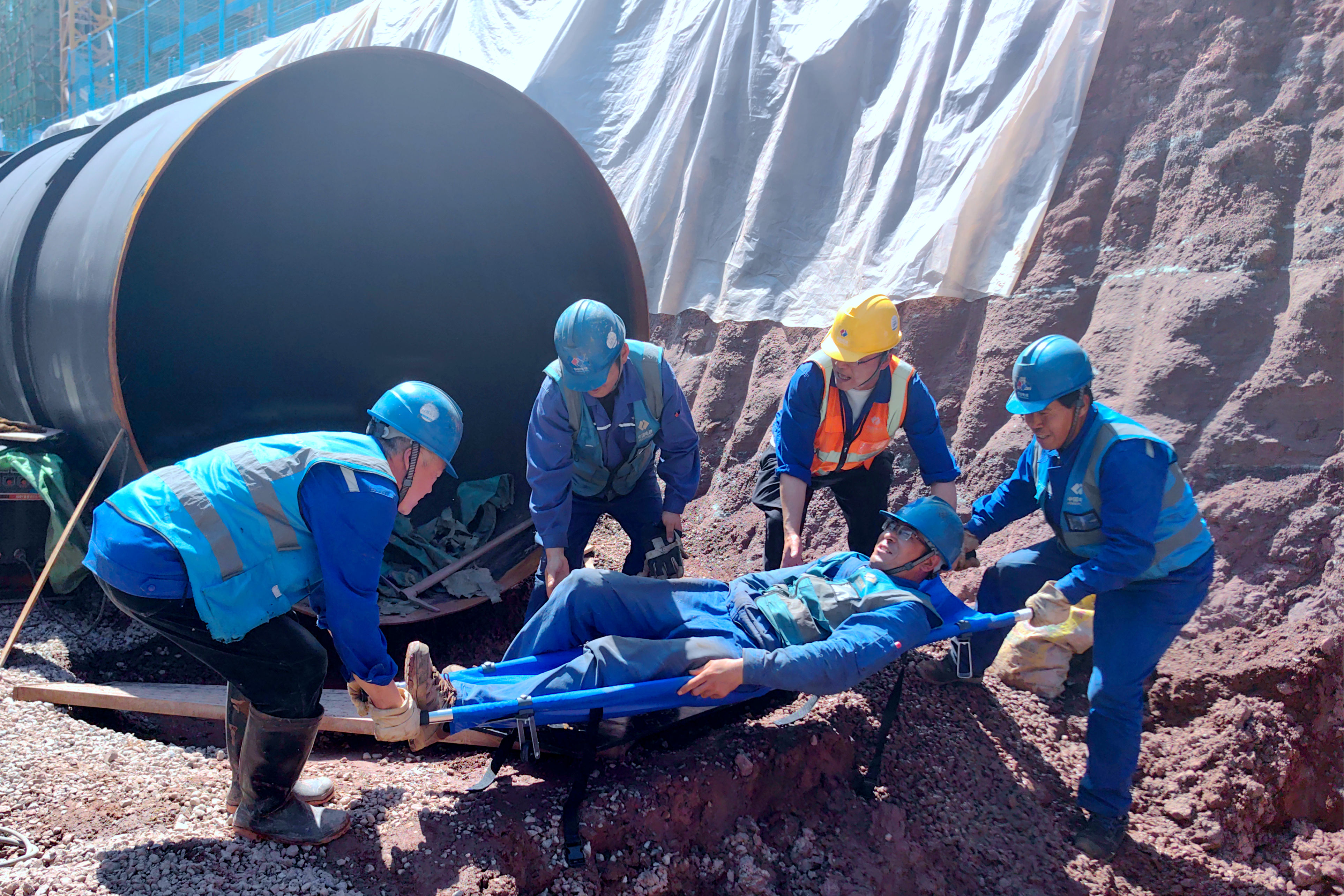 本次演練分為醫(yī)療、救援、后勤、善后4個小組,采用實戰(zhàn)形式進行演練。演練模擬場景為:5月13日下午,施工現(xiàn)場驟降暴雨造成循環(huán)水泵房北側(cè)的循環(huán)水管道基槽邊坡發(fā)生局部塌方,塌方導(dǎo)致基坑下方一名作業(yè)人員和工器具被掩埋,循環(huán)水泵房基坑內(nèi)流入大量積水,如不及時進行抽排可能導(dǎo)致基坑邊坡浸泡發(fā)生大面積坍塌事故,需立即組織人員搶險。接到險情報警后,防汛應(yīng)急指揮部迅速啟動應(yīng)急機制,第一時間組織應(yīng)急救援隊火速趕赴目標(biāo)地點,按照防汛應(yīng)急方案,著眼實戰(zhàn),進行了緊急救險、轉(zhuǎn)移傷員、人員排查、積水抽排等應(yīng)急救援。
