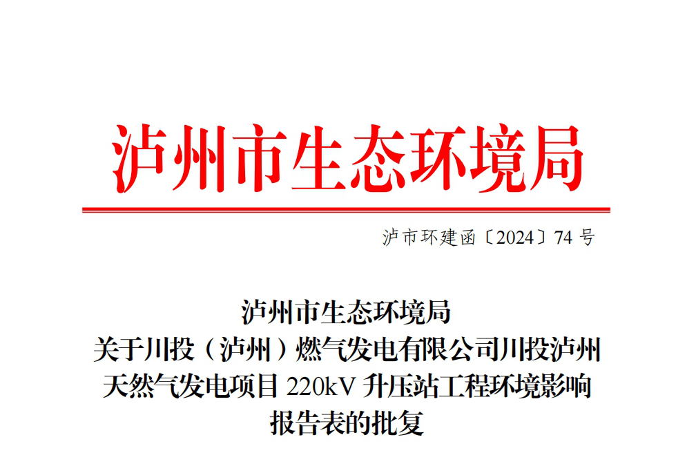 7月30日,公司《川投瀘州天然氣發(fā)電項目220kV升壓站工程環(huán)境影響報告表》順利取得瀘州市生態(tài)環(huán)境局出具的環(huán)評批復(fù),同意項目按照環(huán)評報告書及批復(fù)中所列環(huán)境保護污染防治措施和相關(guān)要求開展220kV升壓站工程建設(shè)和運行。