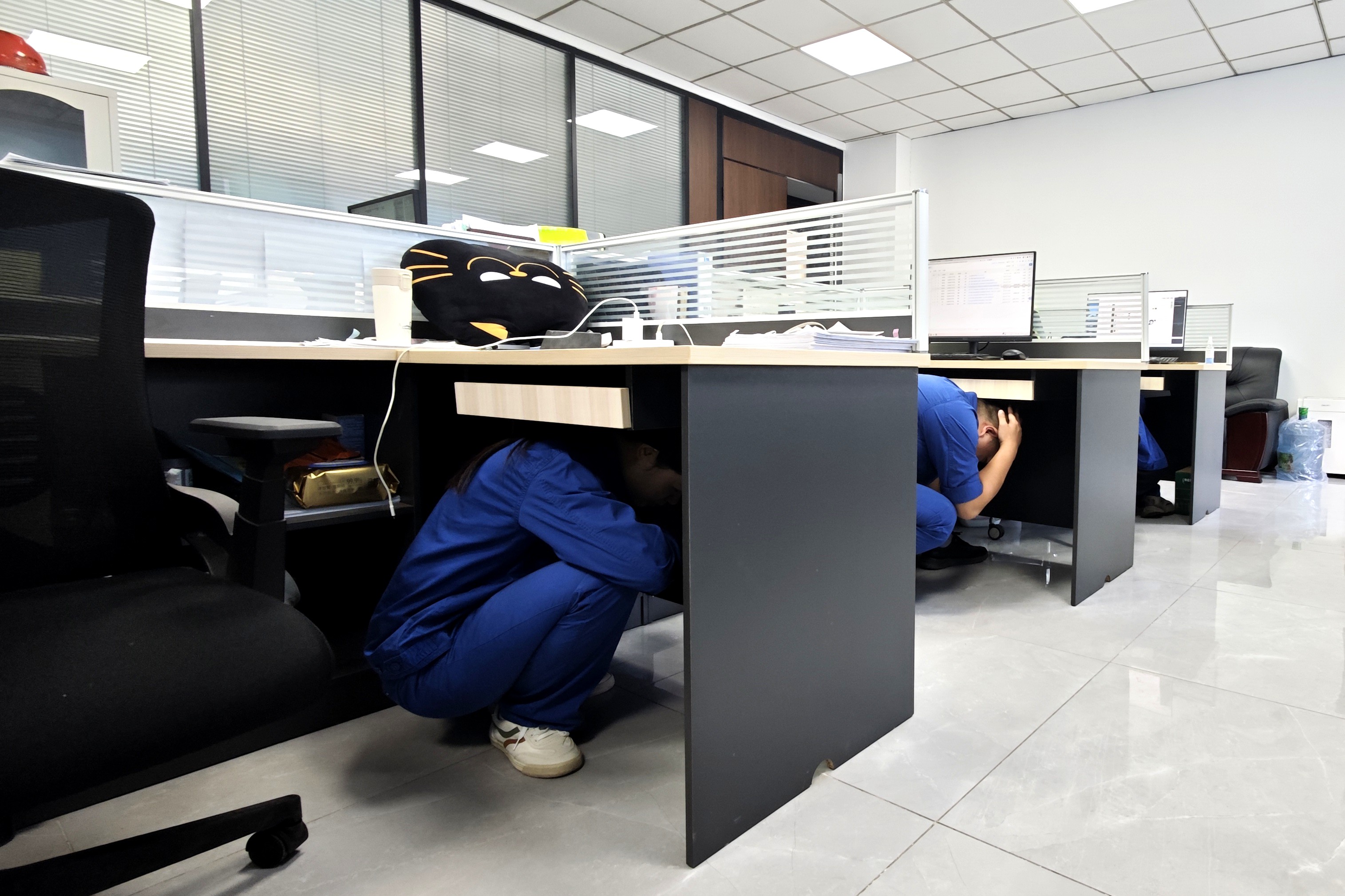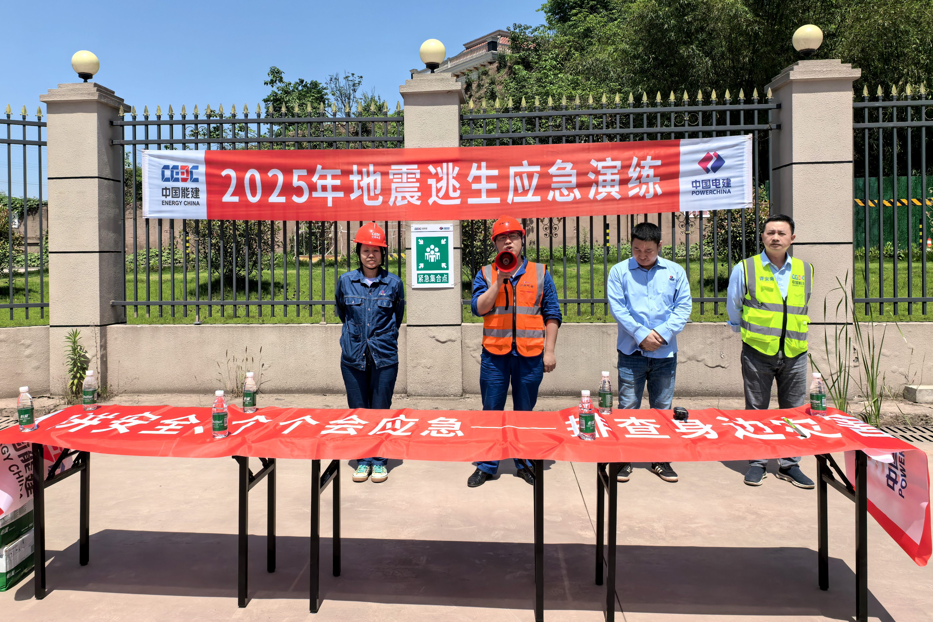 本次演練以公司川投瀘州天然氣發(fā)電項(xiàng)目所在地江陽區(qū)江北鎮(zhèn)突發(fā)地震為背景,設(shè)置項(xiàng)目施工現(xiàn)場(chǎng)、聯(lián)合辦公區(qū)、公司生活區(qū)及參建單位生活區(qū)四個(gè)場(chǎng)景同步演練,系統(tǒng)檢驗(yàn)了各參建單位在緊急避險(xiǎn)、疏散撤離、指揮調(diào)度及應(yīng)急救援等環(huán)節(jié)的協(xié)同處置能力。14時(shí)10分,地震預(yù)警信號(hào)響起,全體人員迅速進(jìn)入緊急避險(xiǎn)狀態(tài),就地避險(xiǎn)。主震結(jié)束后,各區(qū)域人員按照既定逃生路線有序疏散至應(yīng)急避難場(chǎng)所。隨后,應(yīng)急指揮部立即成立,統(tǒng)籌開展災(zāi)情研判、應(yīng)急救援、設(shè)備搶修等關(guān)鍵環(huán)節(jié)工作,全流程驗(yàn)證了應(yīng)急預(yù)案的實(shí)操性。